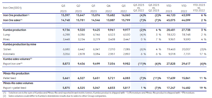 昆巴地區銷量:2023年第三季度,該區域共計銷售887.3萬噸鐵礦石,同比下降11%,環比下降6%。