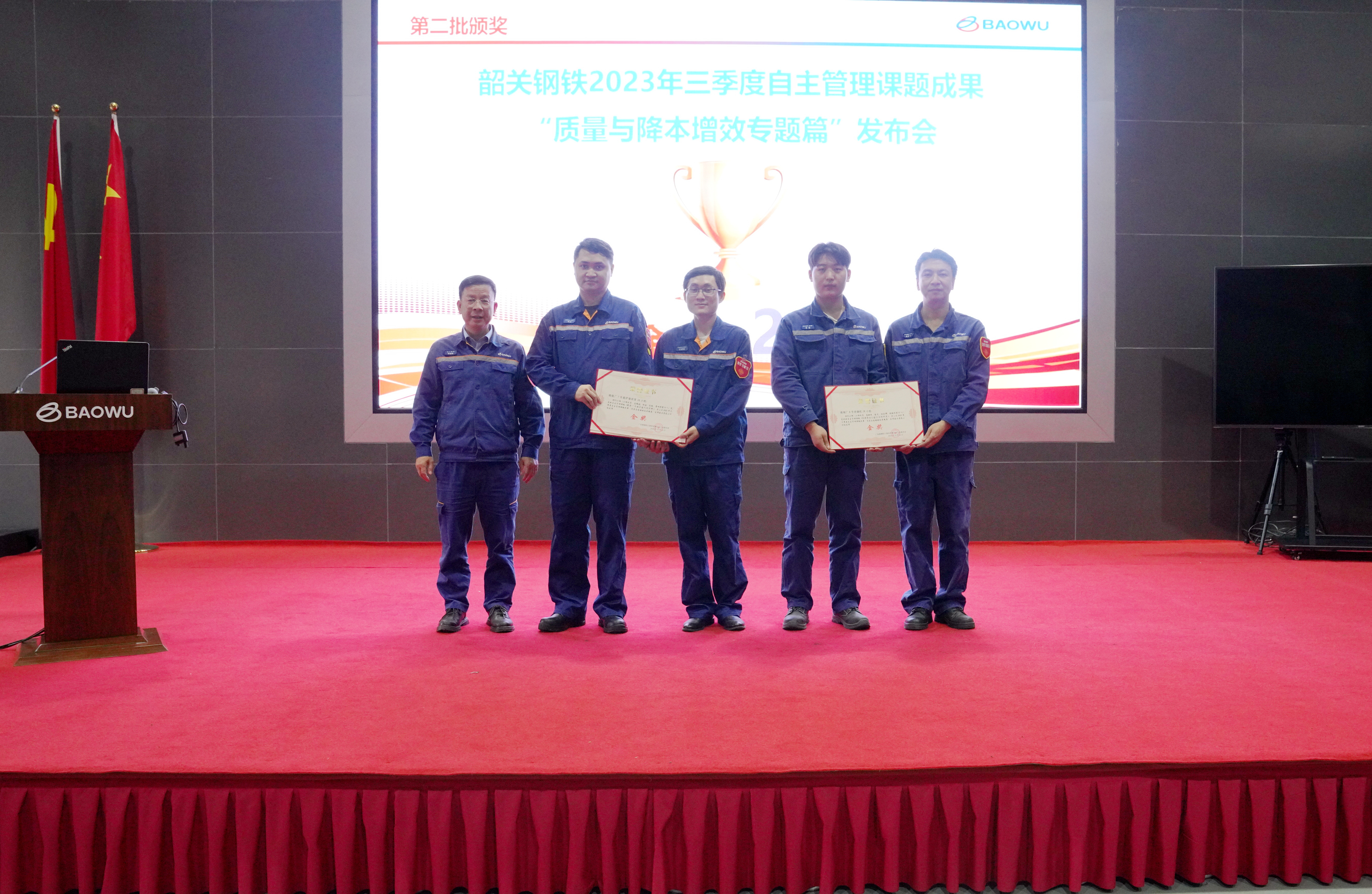 《降低棒一2線噸材廢鋼回收量》《降低7號(hào)TRT軸承運(yùn)行振動(dòng)值》《一種汽車傳動(dòng)軸用38B3正火軋制技術(shù)研發(fā)》《降低CDQ化水超濾裝置進(jìn)水濁度》《降低CDQ化水超濾裝置進(jìn)水濁度》《一種35kV及以下電纜耐壓智能絕緣護(hù)套的研制》等5項(xiàng)優(yōu)秀課題榮獲銀獎(jiǎng)。賴曉敏、曠高峰為獲獎(jiǎng)團(tuán)隊(duì)頒獎(jiǎng)。