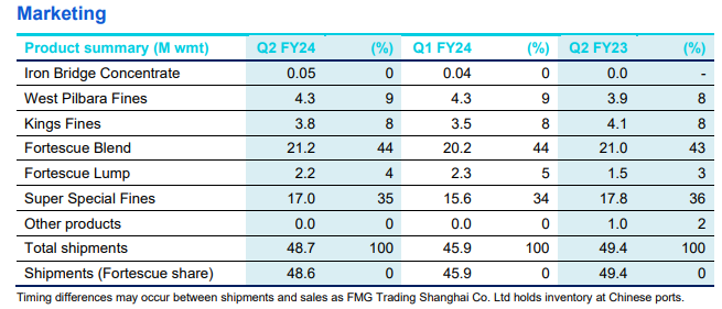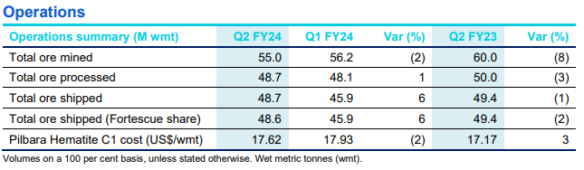 指導(dǎo)方面:2024財(cái)年(2023年7月-2024年6月)鐵礦石指導(dǎo)發(fā)運(yùn)量維持在1.92-1.97億噸(其中,Iron Bridge磁鐵礦項(xiàng)目預(yù)期發(fā)運(yùn)量在200-400萬噸)。2024財(cái)年指導(dǎo)C1現(xiàn)金成本在18-19美元/濕噸區(qū)間內(nèi)(基于假定的澳元平均匯率: 0.68美元)。