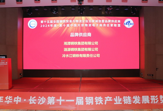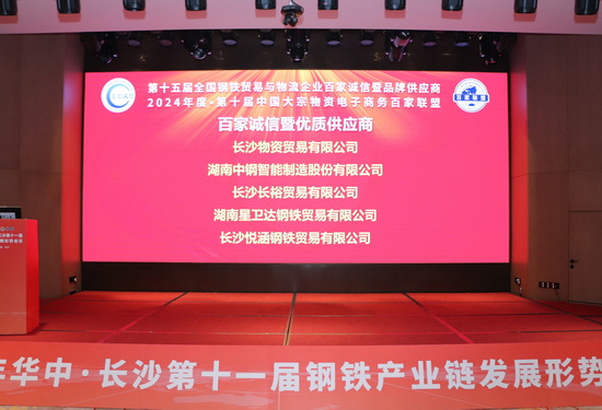 接下來第二項議程為鋼之家網站第十五屆“全國鋼鐵貿易與物流百家誠信暨品牌供應商”和第十屆“中國大宗物資電子商務百家聯盟”(湖南區域)宣讀儀式。獲獎的企業分別是:百家誠信暨優質供應商5家:長沙物資貿易有限公司、湖南中鋼智能制造股份有限公司、長沙長裕貿易有限公司、湖南星衛達鋼鐵貿易有限公司、長沙悅涵鋼鐵貿易有限公司;品牌供應商3家:湘潭鋼鐵集團有限公司、漣源鋼鐵集團有限公司、冷水江鋼鐵有限責任公司。