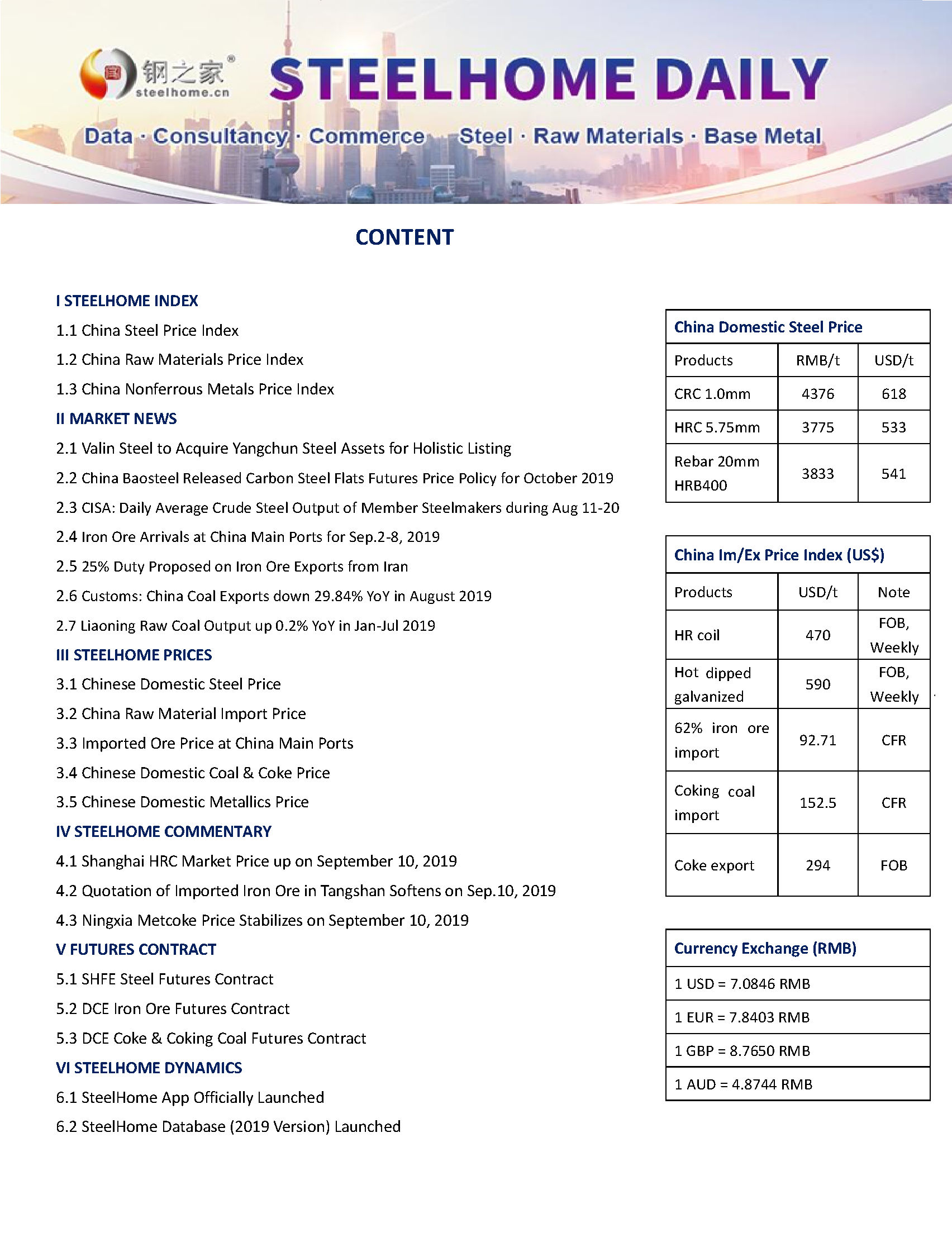 It includes industry news, price of major products, price index of steel & raw materials and market analysis.