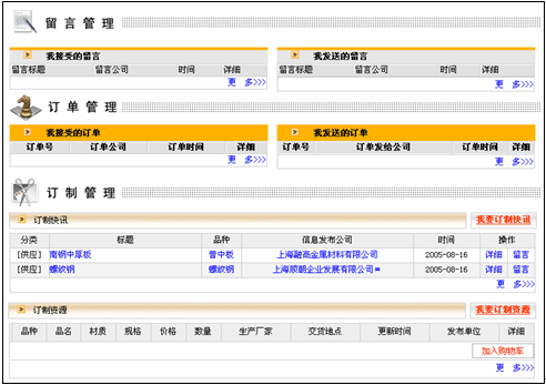 進入“商情中心”首頁,會員直接點擊“我的商務區”進入管理區,可以輕松的查看留言、訂單、訂制內容。